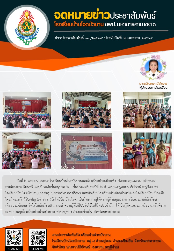 อบรมคุณธรรม จริยธรรมตามโครงการเรียนฟรี ๑๕ ปี ระดับชั้นอนุบาล ๒ – ชั้นประถมศึกษาปีที่ ๒ นำโดยคุณครูสนทร สัตโรจน์ (ครูจิตอาสาโรงเรียนบ้านโจดบัวบาน) คณะครู บุคลากรทางการศึกษา และนักเรียนโรงเรียนบ้านโจดบัวบานและโรงเรียนบ้านเมืองเพ็ง โดยมีพระทวี สิริปญฺโญ (เจ้าอาวาสวัดโพธิ์ชัย บ้านโจด) เป็นวิทยากรผู้ให้ความรู้ด้านคุณธรรม จริยธรรม แก่นักเรียน เพื่ออบรมขัดเกลาจิตใจให้นักเรียนสามารถนำความรู้ที่ได้ไปปรับใช้ในชีวิตประจำวัน ให้เป็นผู้มีคุณธรรม จริยะรรมอันดีงาม ณ หอประชุมโรงเรียนบ้านโจดบัวบาน ตำบลกู่ทอง อำเภอเชียงยืน จังหวัดมหาสารคาม