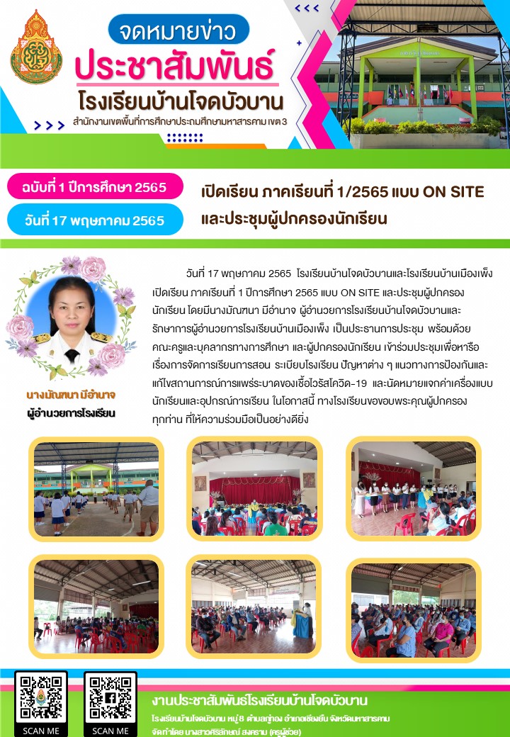วันที่ 17 พฤษภาคม 2565 โรงเรียนบ้านโจดบัวบานและโรงเรียนบ้านเมืองเพ็ง เปิดเรียน ภาคเรียนที่ 1 ปีการศึกษา 2565 แบบ ON SITE และประชุมผู้ปกครองนักเรียน