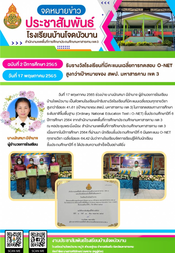 วันที่ 17 พฤษภาคม 2565 ช่วงบ่าย นางมัณฑนา มีอำนาจ ผู้อำนวยการโรงเรียนบ้านโจดบัวบาน เป็นตัวแทนโรงเรียนเข้ารับรางวัลโรงเรียนที่มีคะแนนเฉลี่ยรวมทุกรายวิชาสูงกว่าร้อยละ 41.61 (เป้าหมายของ สพป. มหาสารคาม เขต 3) ในการทดสอบ