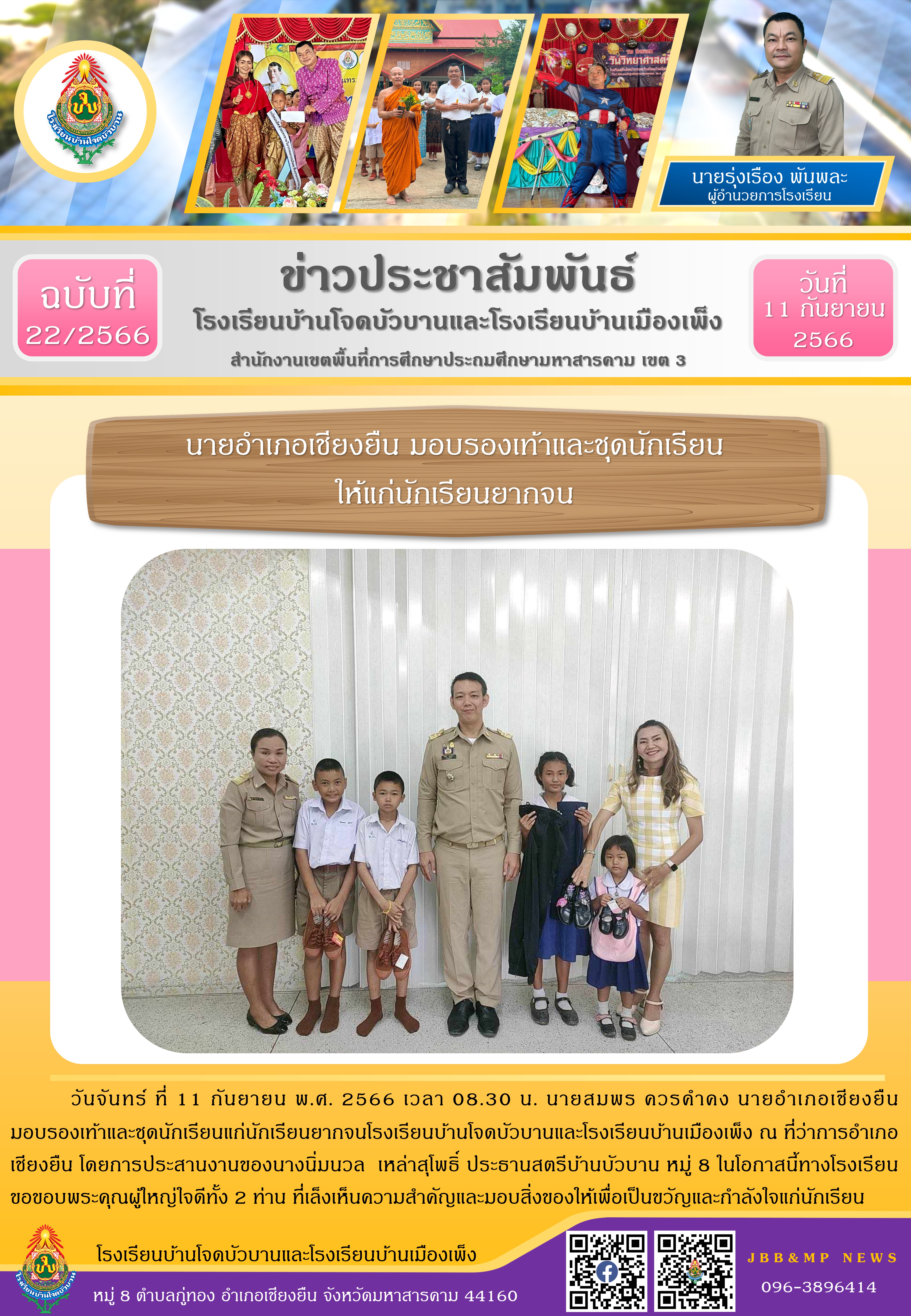 จดหมายข่าวประชาสัมพันธ์ ฉบับที่ 22/2566 วันที่ 11 กันยายน 2566 นายอำเภอเชียงยืน มอบรองเท้าและชุดนักเรียนให้แก่นักเรียนยากจน